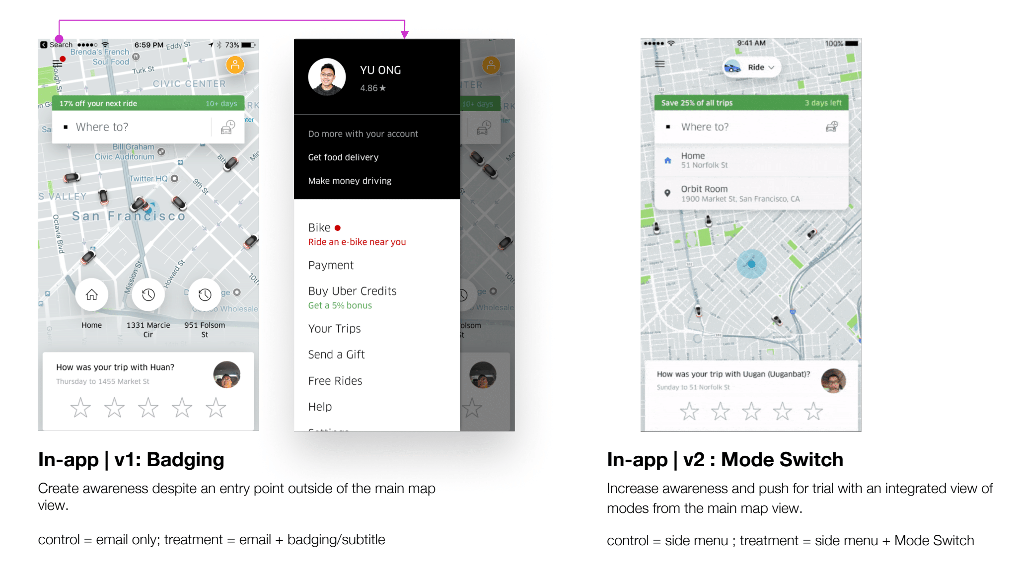 "And so we did some stuff, we experimented, we A/ B tested. We tried to add a badge, which is this red dot, and hoped people would click saying this red dot the on the side. We tested colors too. Red was pretty stressful. Then we tested green. Green was , 'oh I need to update something - is my credit card expired?' And then we ended up with blue. All of this takes several weeks of iteration, and we tested copy too obviously. And then after that, we moved to what you have now in your app. And if you're in a city where you have access to two Bike and Scooters, we have what we call mode switch, so we move from the side menu to back on the map to create more in App discoverability. And that was harder to build for sure, but obviously drove much more adoption. Results speak for themselves."