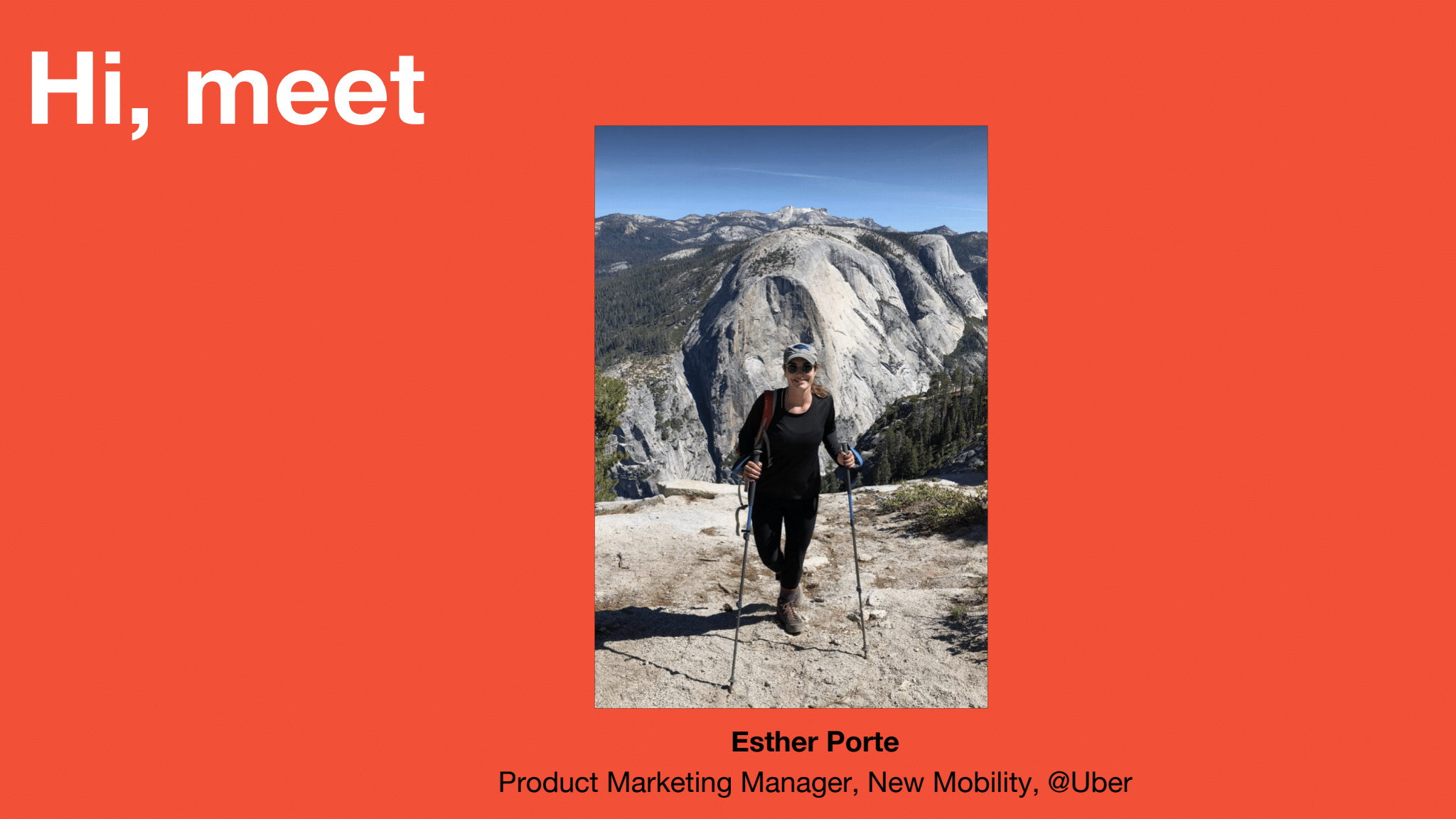 "Great. So, quick agenda for today. I'll speak about what a PMM does at Uber, although I know we all have a lot of context and I see many of you are PMMs already but maybe we'll see some differences. And then I'll speak about how we'll launch bikes and scooters which are 0-1 products in the Uber universe. Then the JUMP brand, since we have the opportunity to have the bike here in the office right next door. I'll think about how JUMP is positioned. Then forward looking, how our PMMs at Uber are shaping the next vision of what Uber will be in the near future. And then a Q&A hopefully."