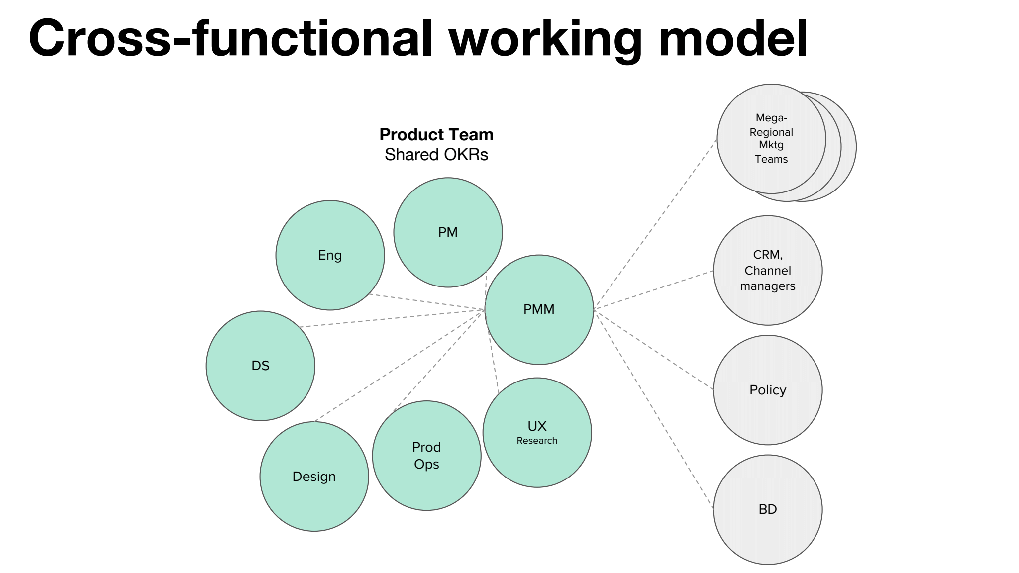 "I believe that [this is] pretty similar to all the PMMs I've been talking to here. We are embedded in product teams. We do share some OKRs. And, as I was saying before, we do own specific key results. And we work though with a bunch of different teams like CRMs. Uber has a separate marketing organisation with all the different channels you could imagine. We work with policy. Specifically in that campaign I just mentioned when targeting drivers, we work with business development, and also our different mega regional marketing teams all across the world. So, for a product like Lite that launched in India first, as PMMs, you really have to travel there and understand the market and stay for a month to really understand deeply what the needs are."
