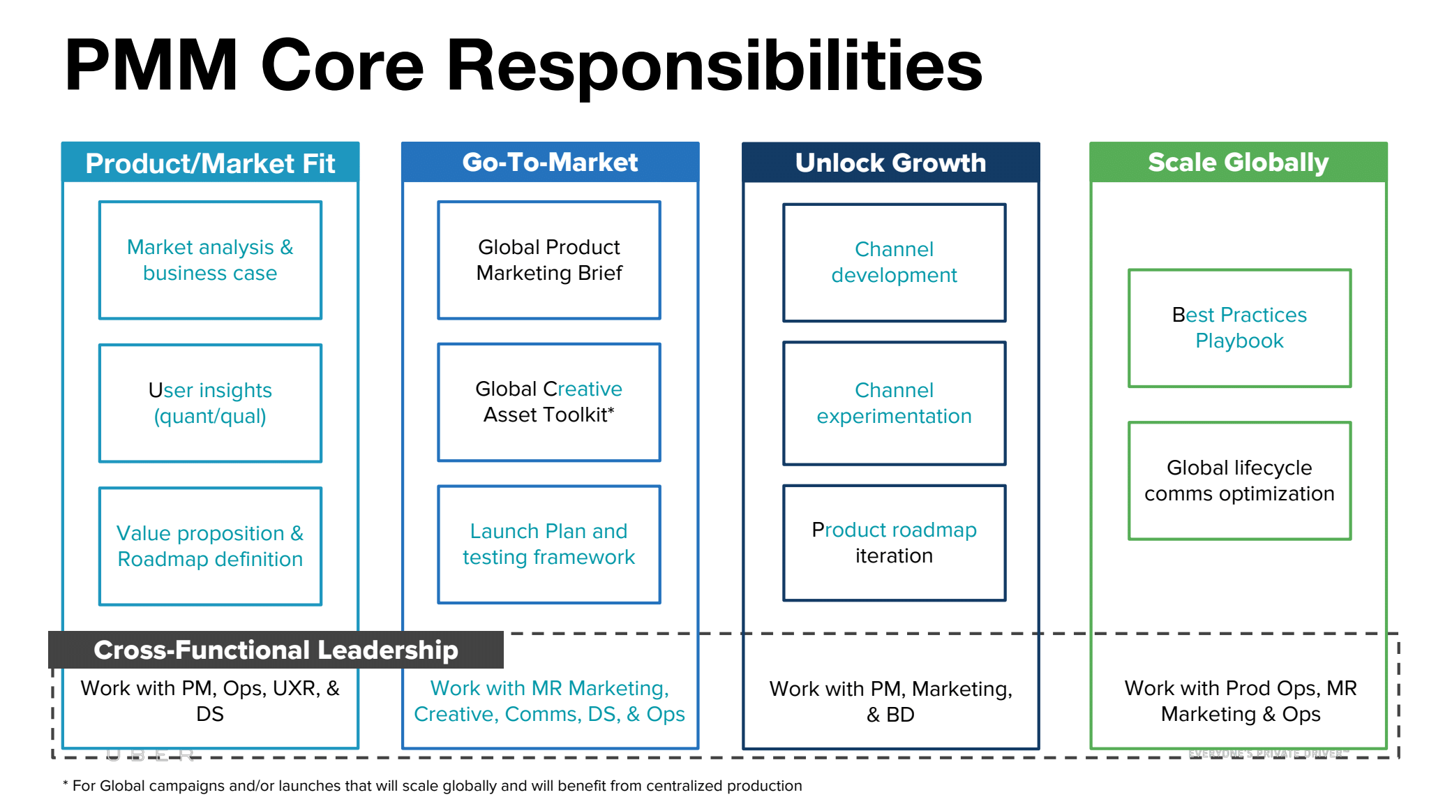 "PMMing/Product Marketing: we have a global role because of the nature of the business, and we work with in-market counterparts. But, we influence a different moment and we do own specific OKRs in this in this product map. Any questions before I move on? Okay, I think we keep that until the end. I'll just follow the rules!"