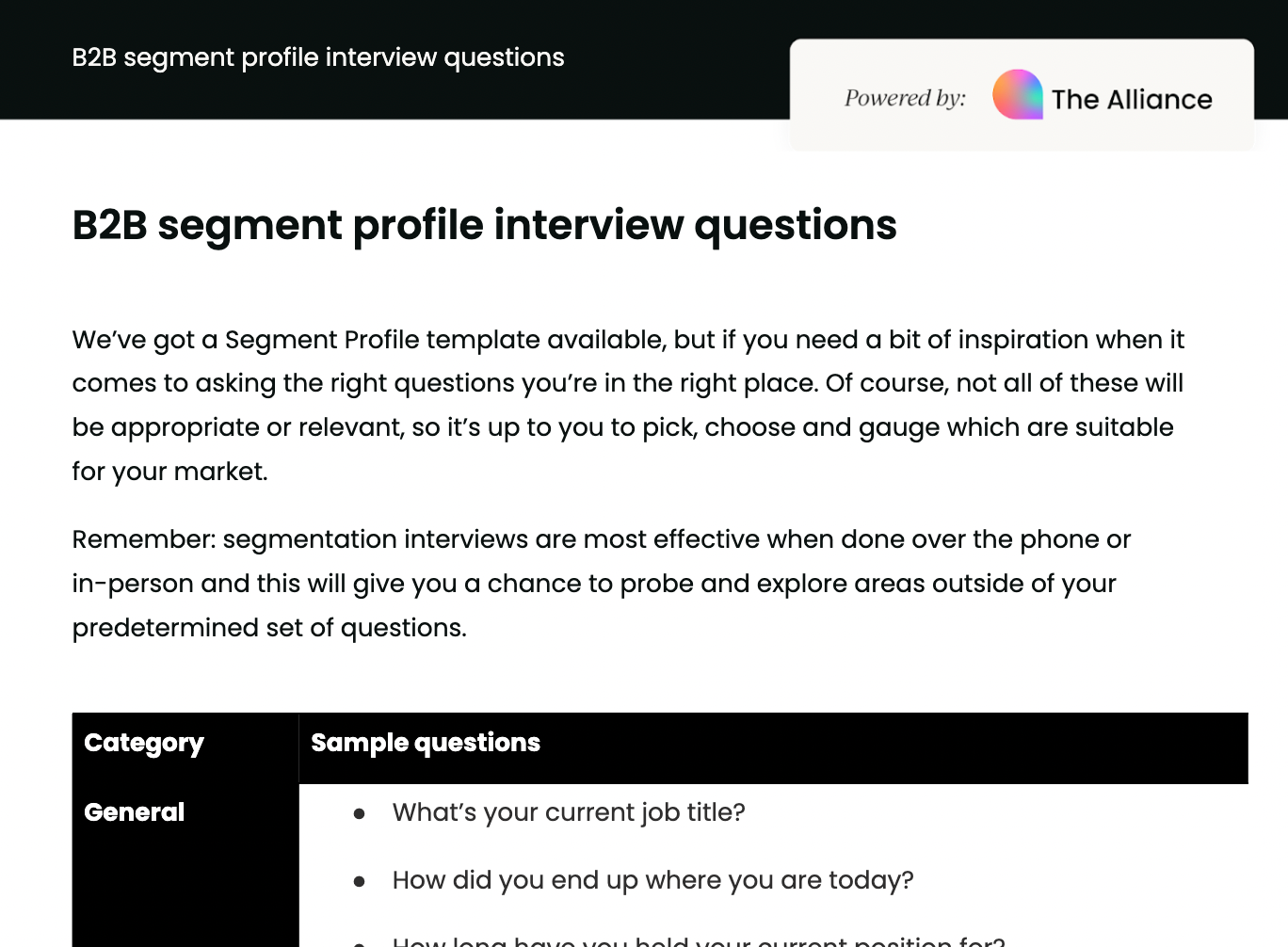 B2B segment profile interview questions We’ve got a Segment Profile template available, but if you need a bit of inspiration when it comes to asking the right questions you’re in the right place. Of course, not all of these will be appropriate or relevant, so it’s up to you to pick, choose and g…