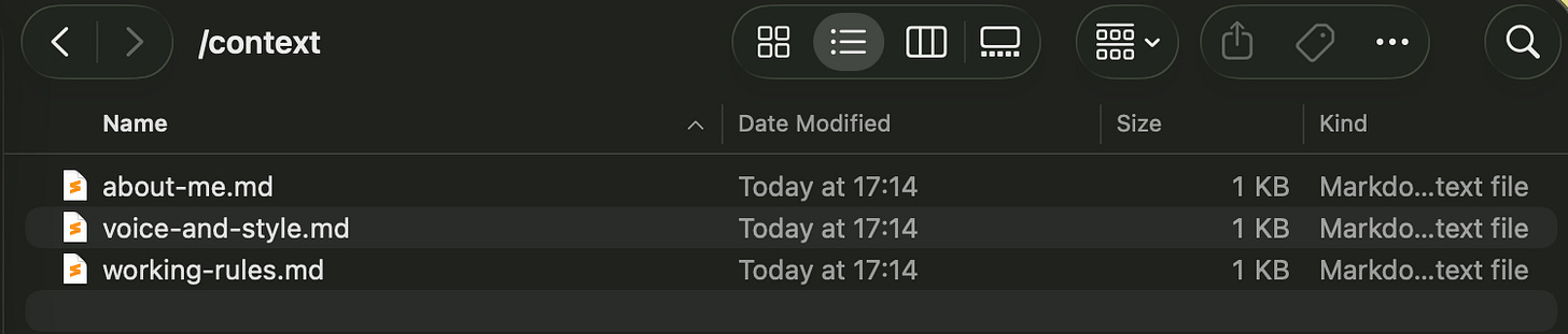 - /context – your about-me, voice, and rules files (more on these below)