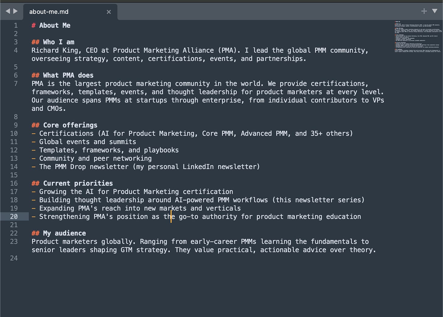 - about-me.md: Who you are, what you do, what you’re working on. Your role, company, product, market, current priorities. Be specific: “I’m the PMM lead for a B2B data platform targeting mid-market RevOps teams, currently preparing for a Q3 launch of our analytics module” gives Claude vastly more to work with than “I’m a product marketer.” This is mine, for reference: