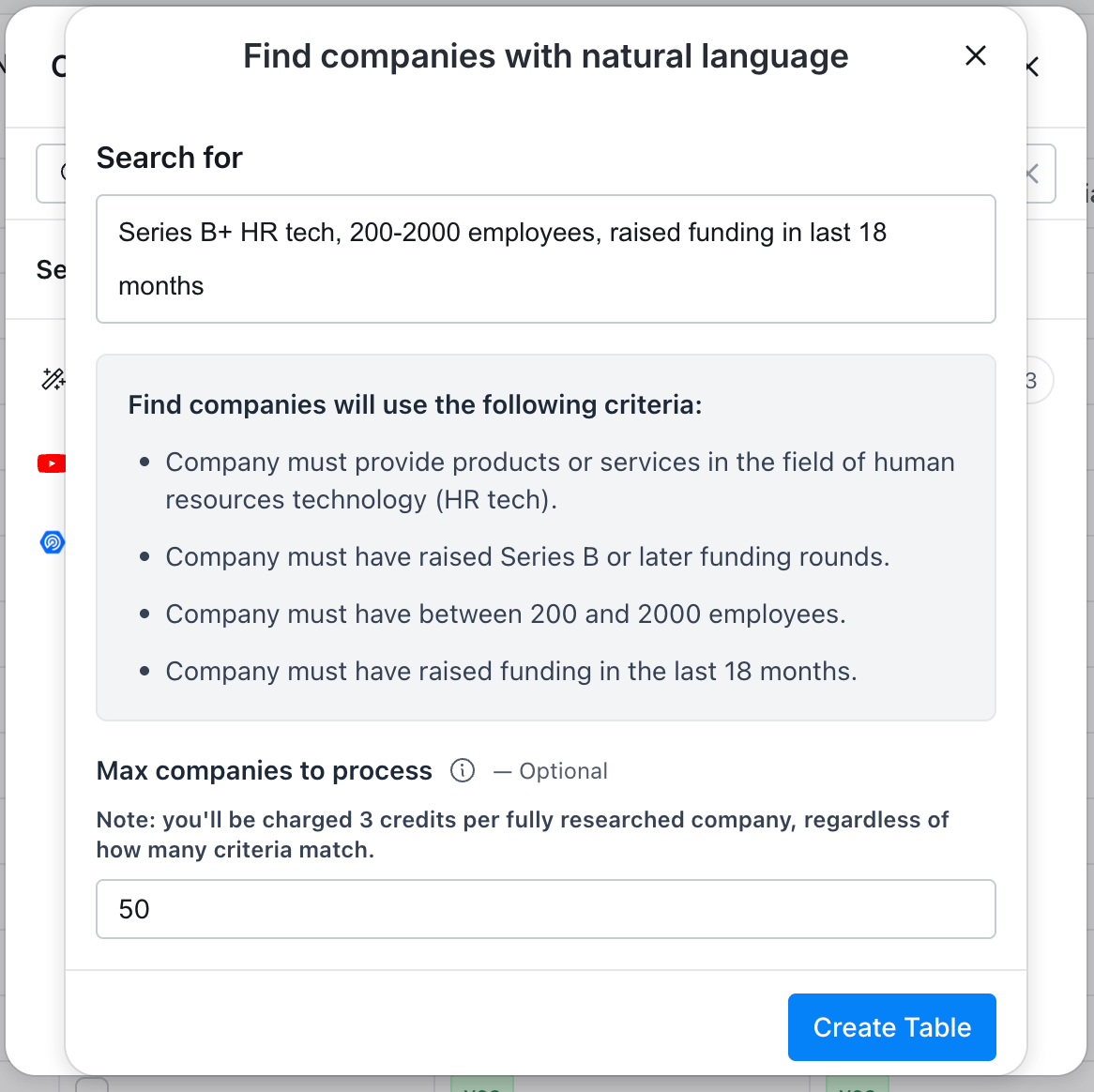 - Define your ICP parameters once: Series B+ HR tech, 200-2000 employees, raised funding in the last 18 months (using Clay’s “Find Companies” feature with natural language)