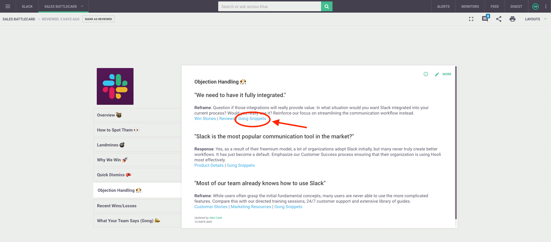 To help salespeople see what a good response sounds like in real life, we suggest using Gong snippets within your battlecards to reinforce your objection handling strategies.