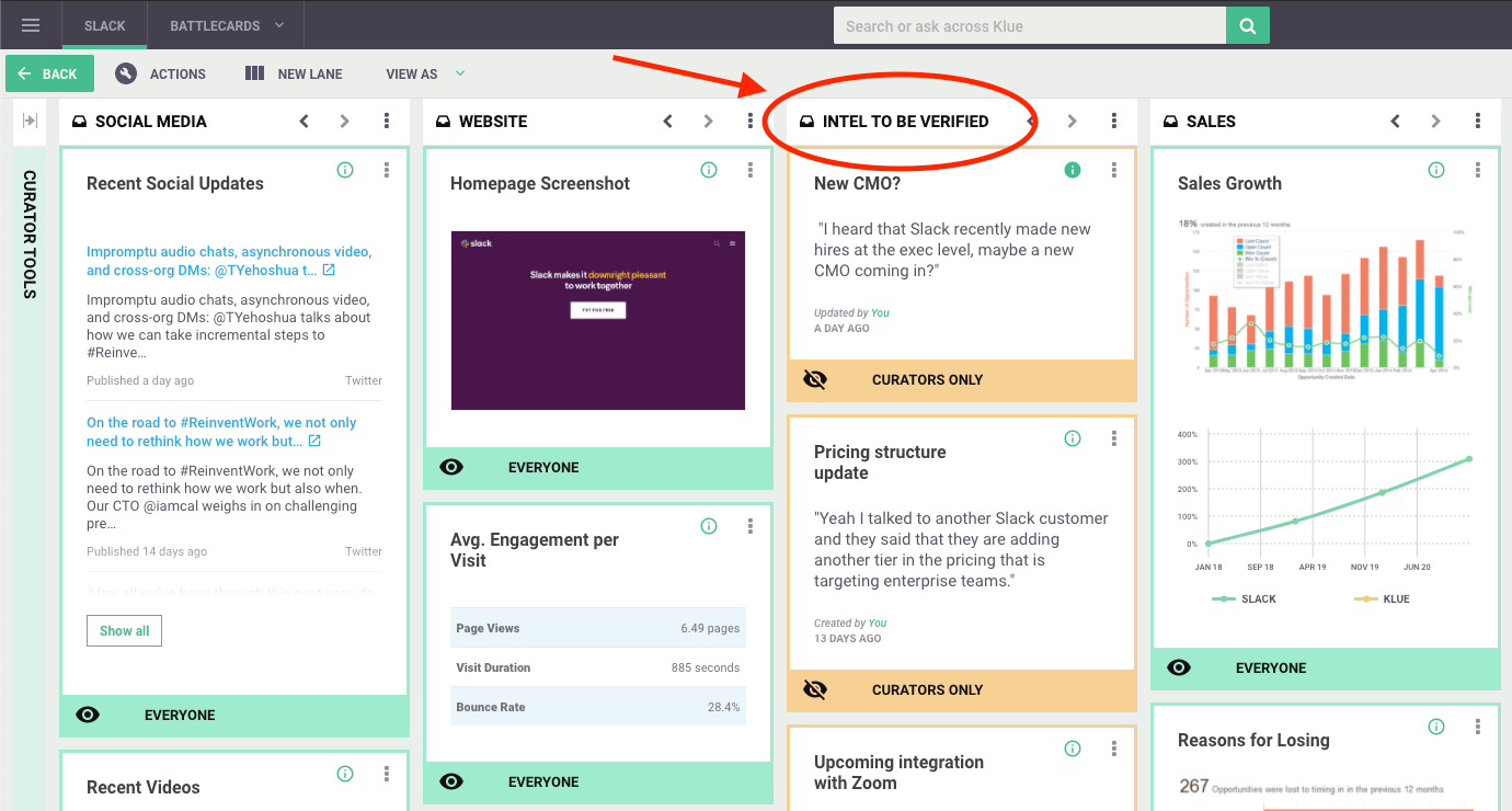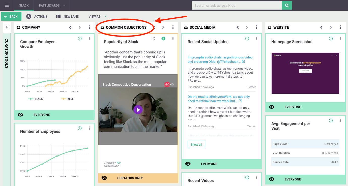 We keep these cards visible to only our curator team, so we have the ability to verify and create competitive responses before publishing for our entire sales team to use. It’s a handy way to organize intel that isn’t yet ready to be used in the field.