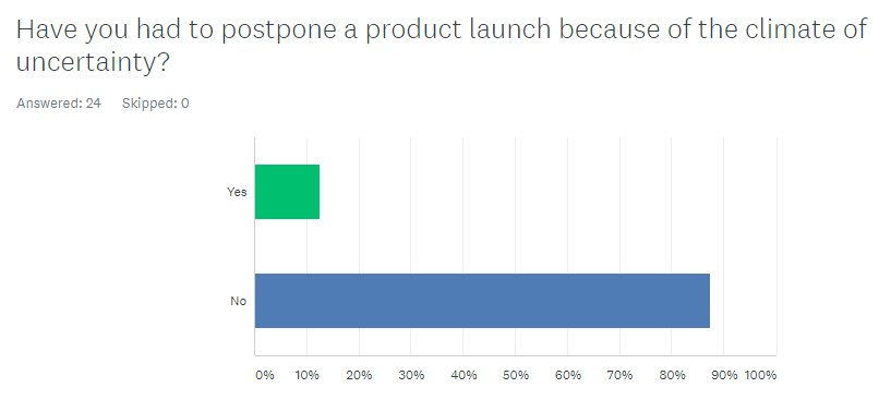An overwhelming majority of product marketers, over 87% of product marketers said they did NOT postpone a product launch because of the climate of uncertainty.