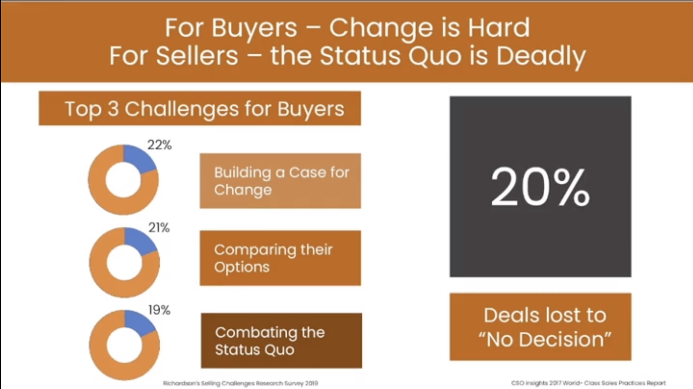 The accepted data says that we lose about 20% of deals to the status quo. When I say lose, I mean, you got on a shortlist, you went all the way through a sales process, you got right down to make the decision, and the company said, 'we're just gonna keep doing what we're doing right now'. That's terrifying.