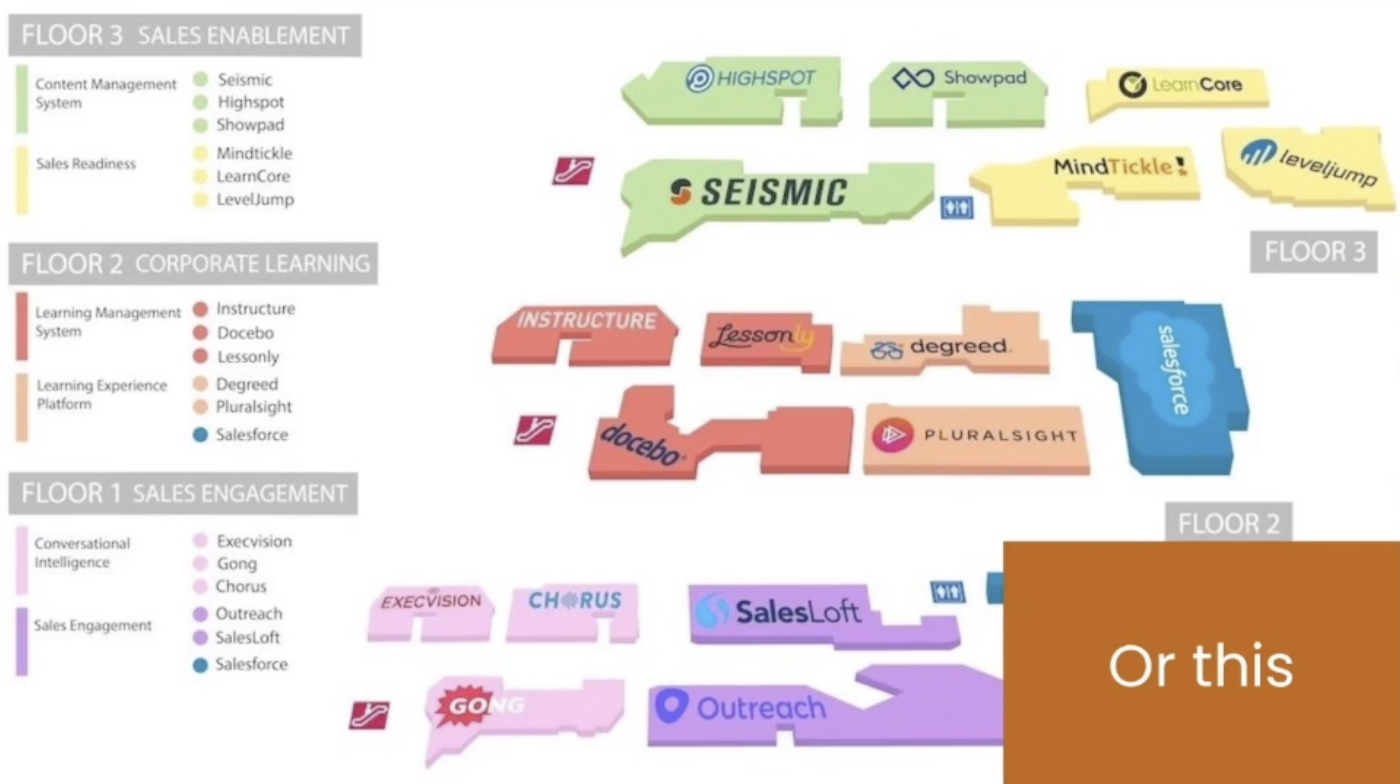 "Look, you're going to have conversational intelligence and sales engagement. Most of you guys have that already. That's Sales Loft and Gong and whatever. On top of that, you're going to build corporate learning - that's completely separate and it looks like this. That's where Lessonly and Pluralsight all sit, Salesforce has an offering there. On top of that, we've got sales enablement, and that splits into content management solutions and sales readiness, if what you want is sales readiness, that's the yellow stuff and that's where we fit.”
