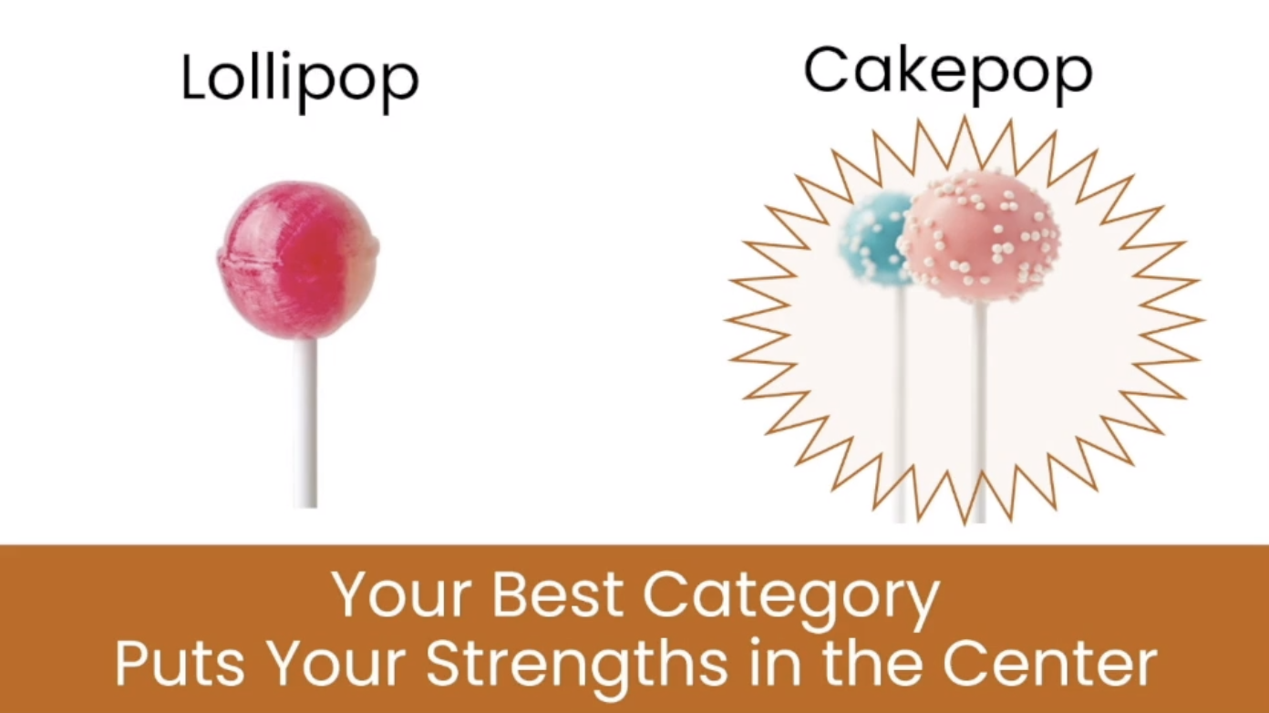 If what I'm looking for is a lollipop for grown-ups at the coffee shop, Cakepop wins. My best market category takes my strings and puts them right at the center of what my product is all about.