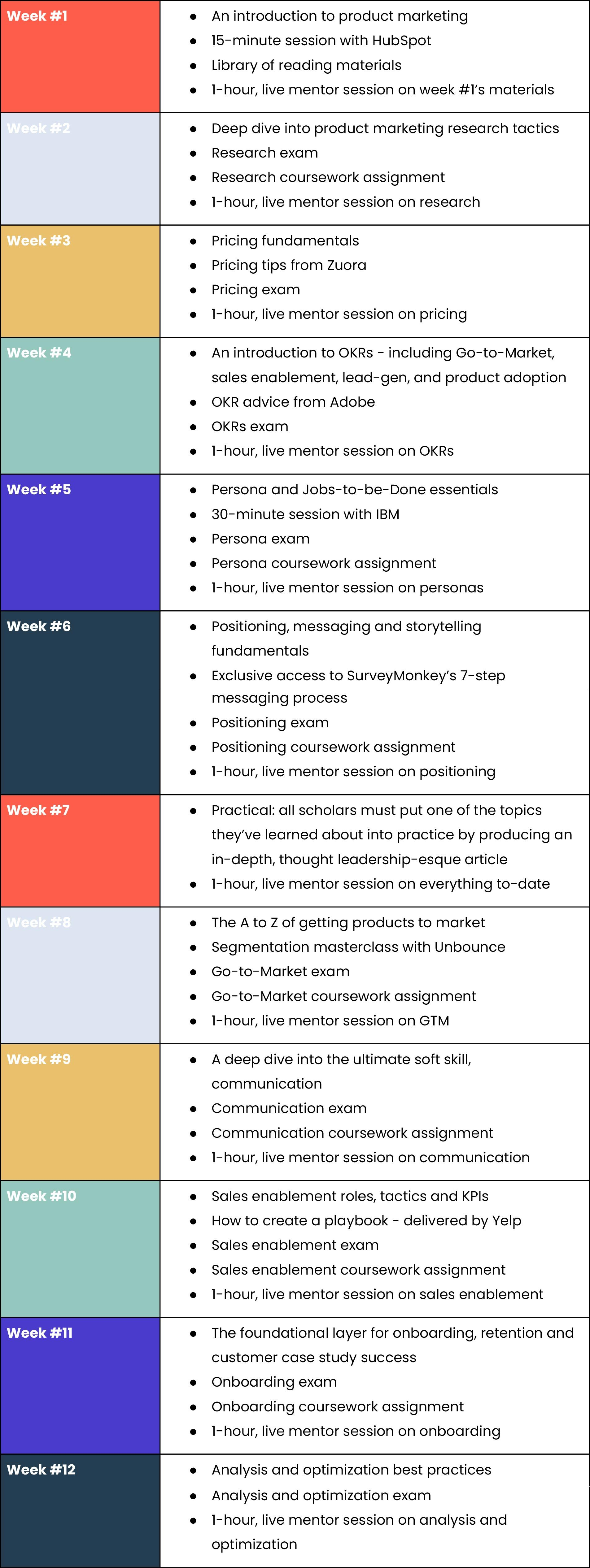 The role of product marketing is varied and so our program is too. Each week, we’ll be honing in on the core skills and competencies required to nail the job, and there’ll be a real mix of self-paced, practical, and live elements to get involved with.
