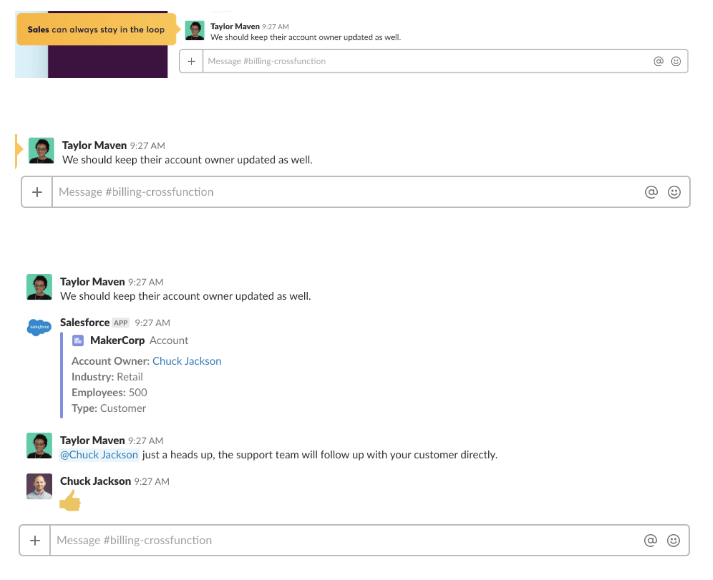 Narrative Action: Team member finds Sales account owner via Salesforce and provides update on customer question