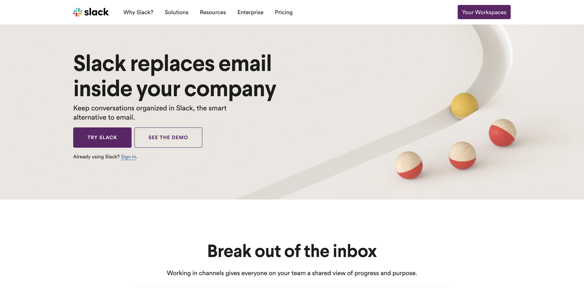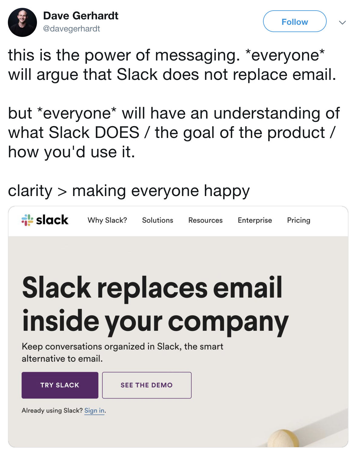 Slack’s landing page hooks prospects with a clear, provocative headline: “Slack replaces email inside your company.” This is an example of what former Drift VP of Marketing Dave Gerhardt calls “picking an enemy.” Whether Slack truly replaces email may be up for debate, but the provocative claim grounds prospects in a clear way of thinking about the product and piques their curiosity.