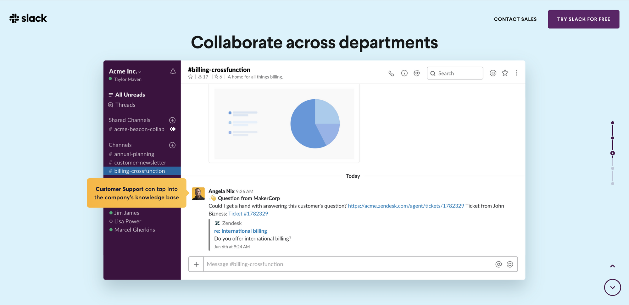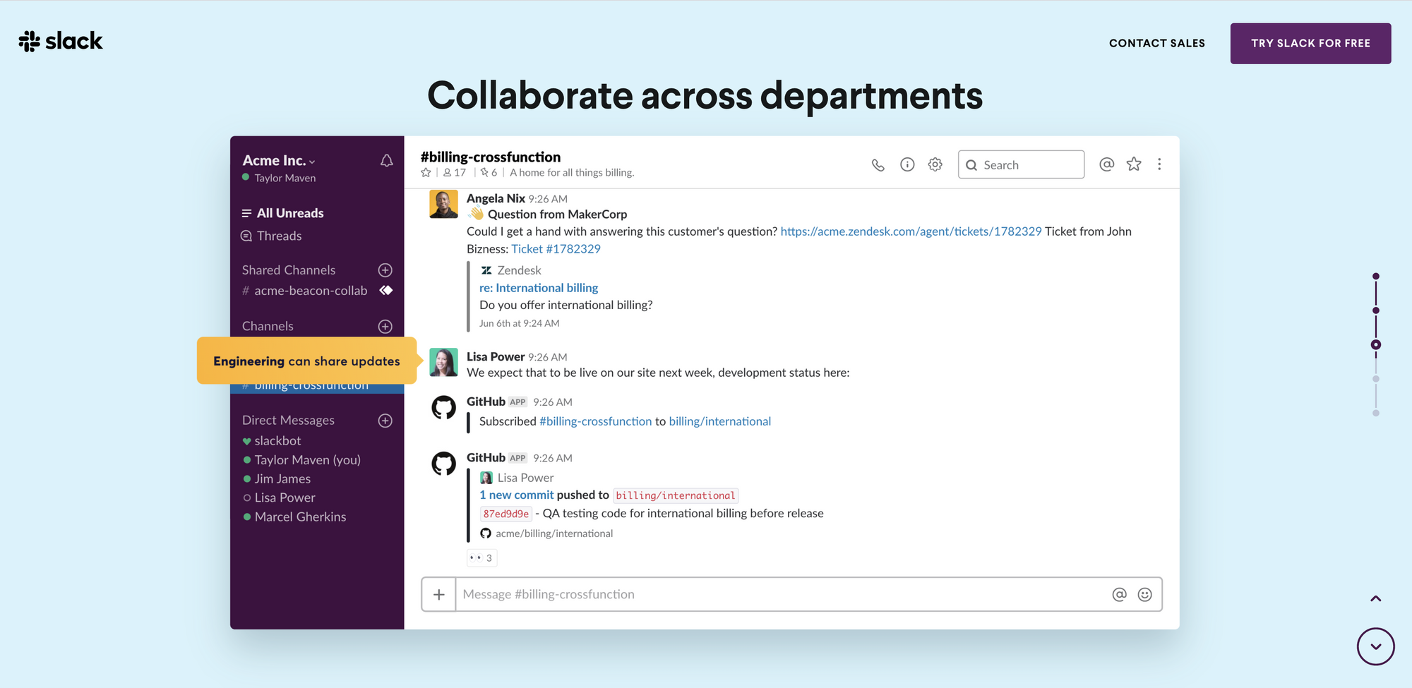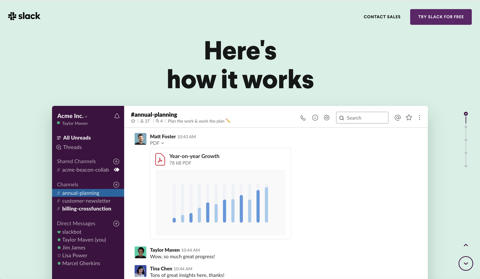 Slack’s demo accomplishes this zoom effect in its third section by focusing on a single conversation between user personas to illustrate how the product enables collaboration across business units.