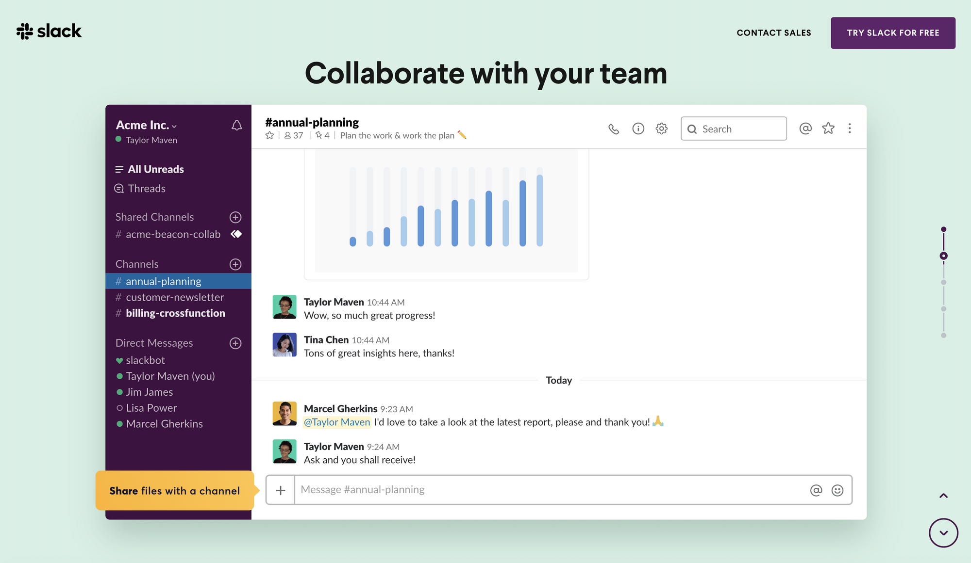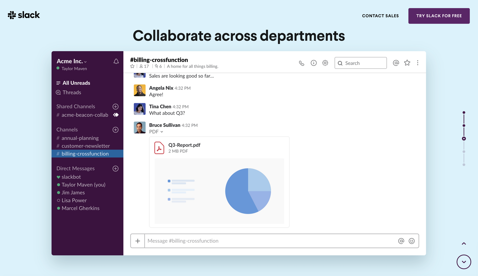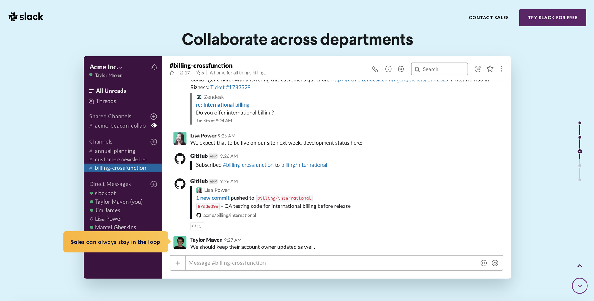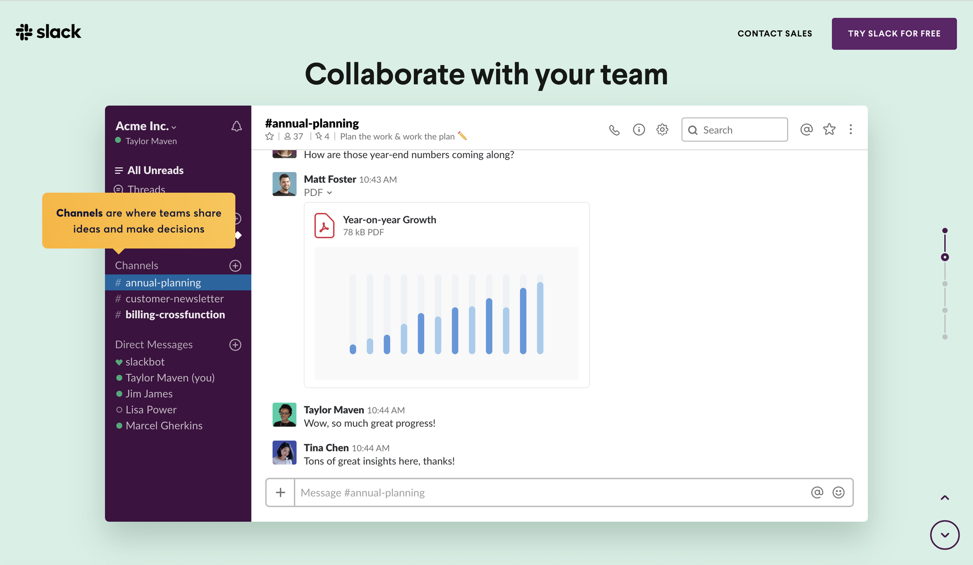 Slack’s demo accomplishes this zoom effect in its third section by focusing on a single conversation between user personas to illustrate how the product enables collaboration across business units.