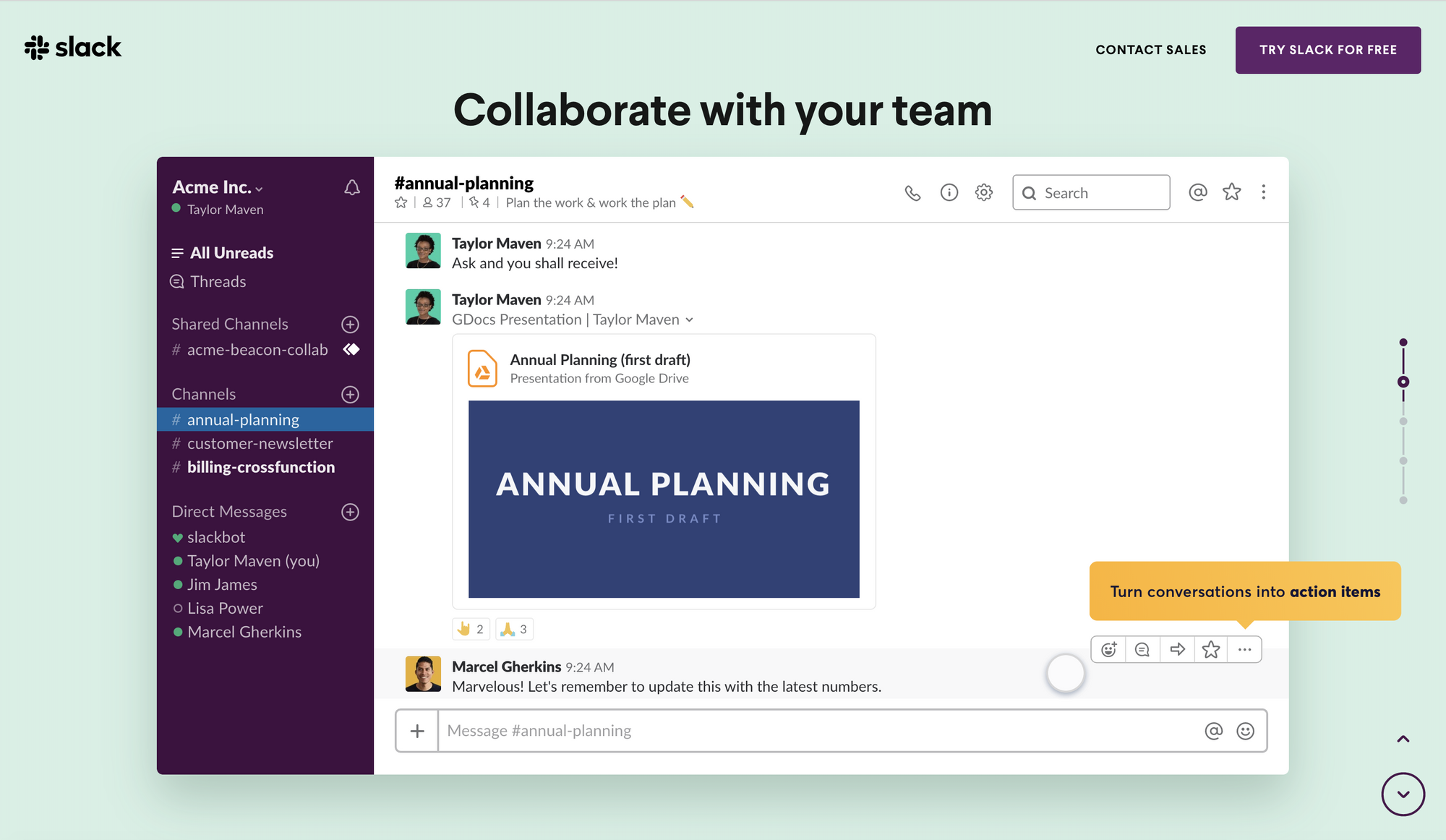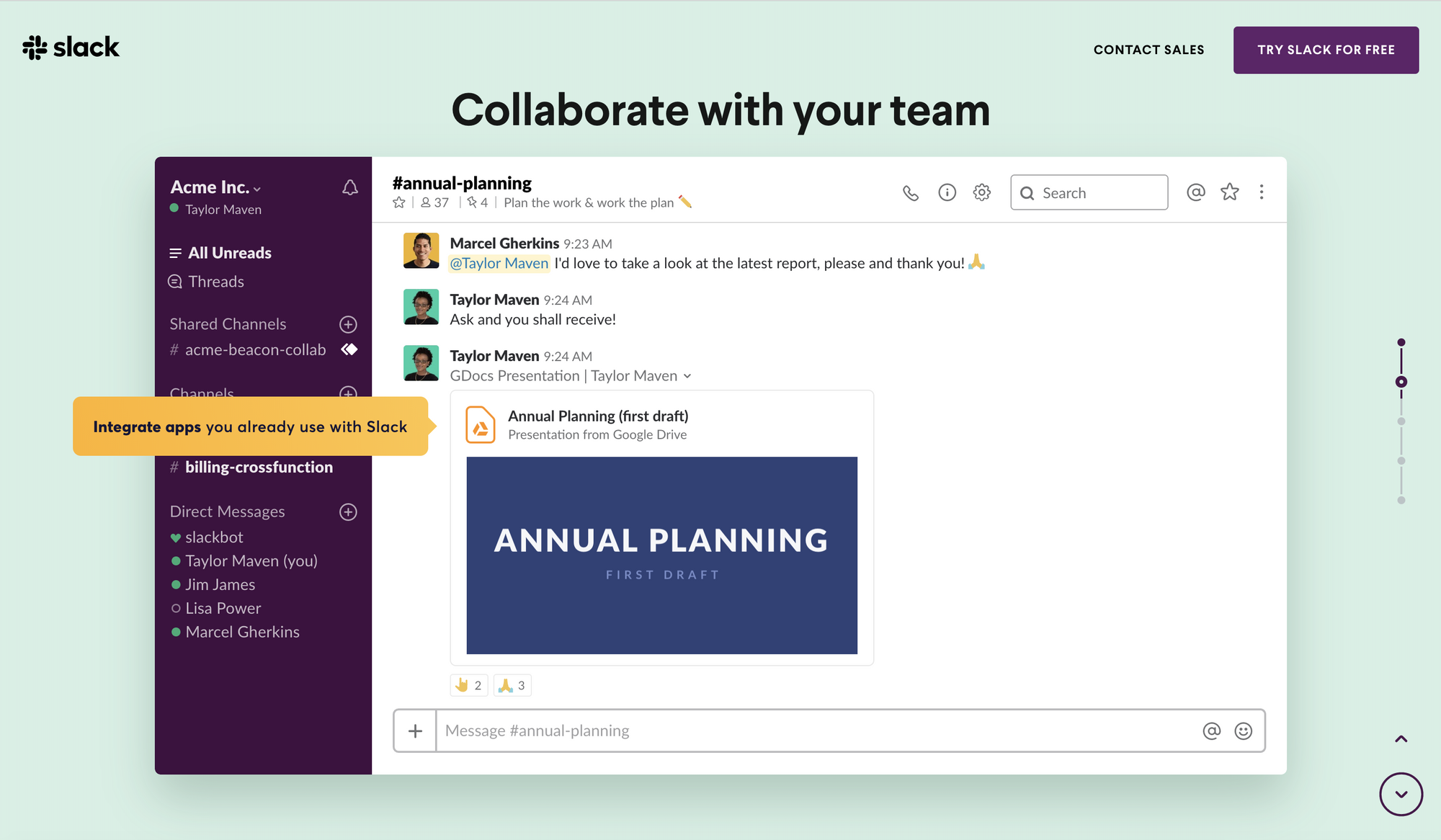Like most strong narratives, Slack’s demo follows the classic “Claim > Show > Explain” model. Slack reinforces the claim that its platform is “How work happens” by defining three pillar product benefits early on: easy integration with enterprise software tools, centralized information organization and knowledge management, and enhanced collaboration and productivity.
