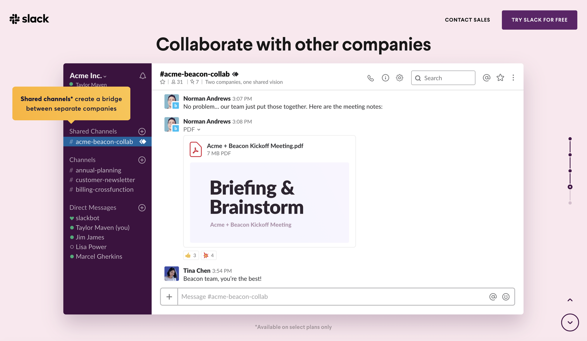 Pull: Similar to a conference bridge, company data and Slack instances remain separate and secure.