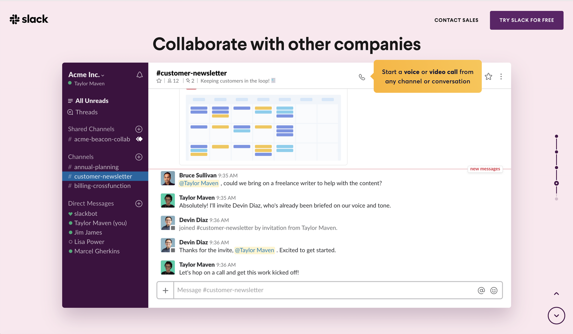Push: Use Slack as a central platform for all external communication, including voice and video calls.