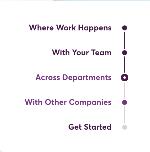 After clicking “See the Demo” prospects are met with a scrolling interactive demo broken into five sections: 1) Where Work Happens 2) With Your Team 3) Across Departments 4) With Other Companies 5) Get Started.