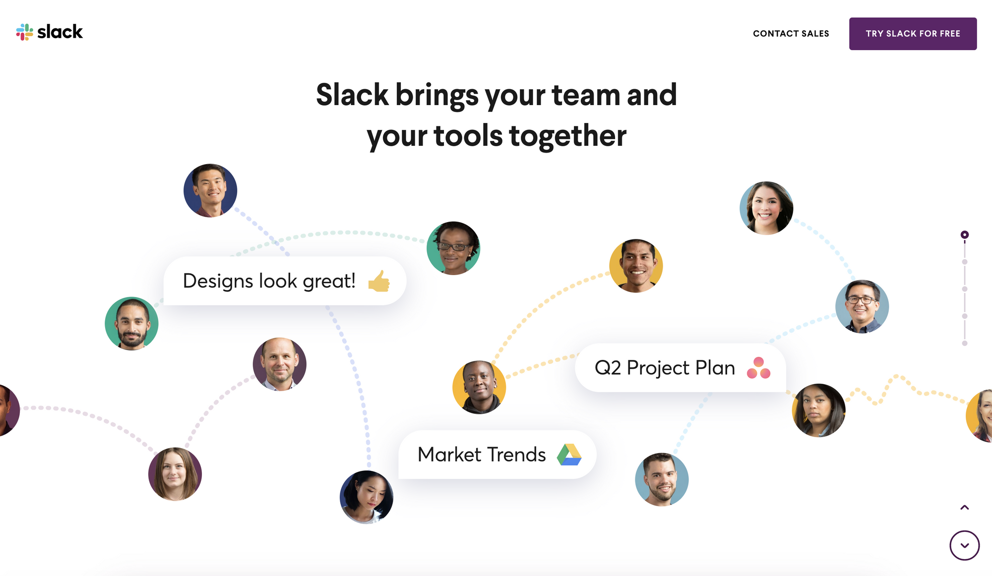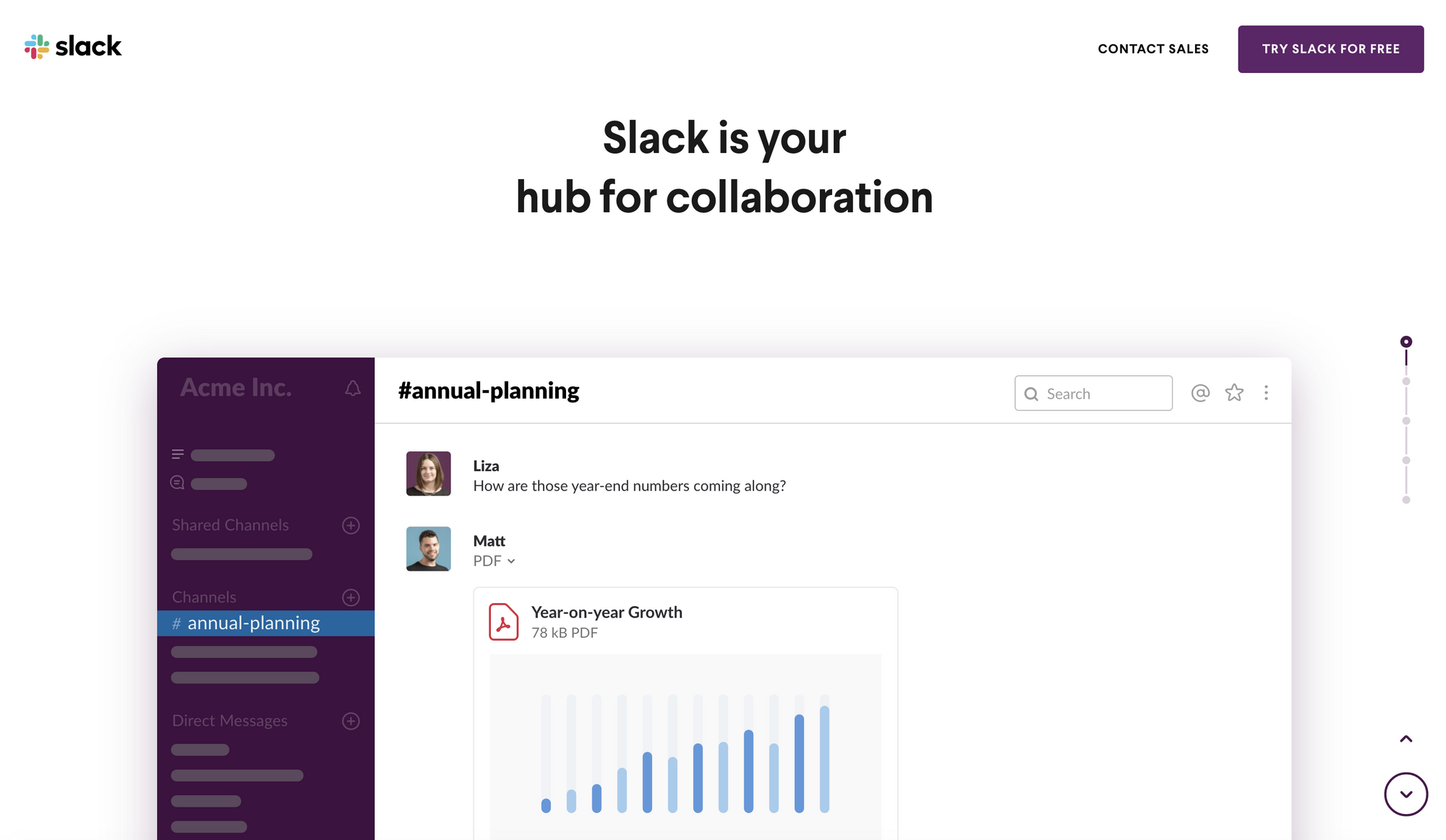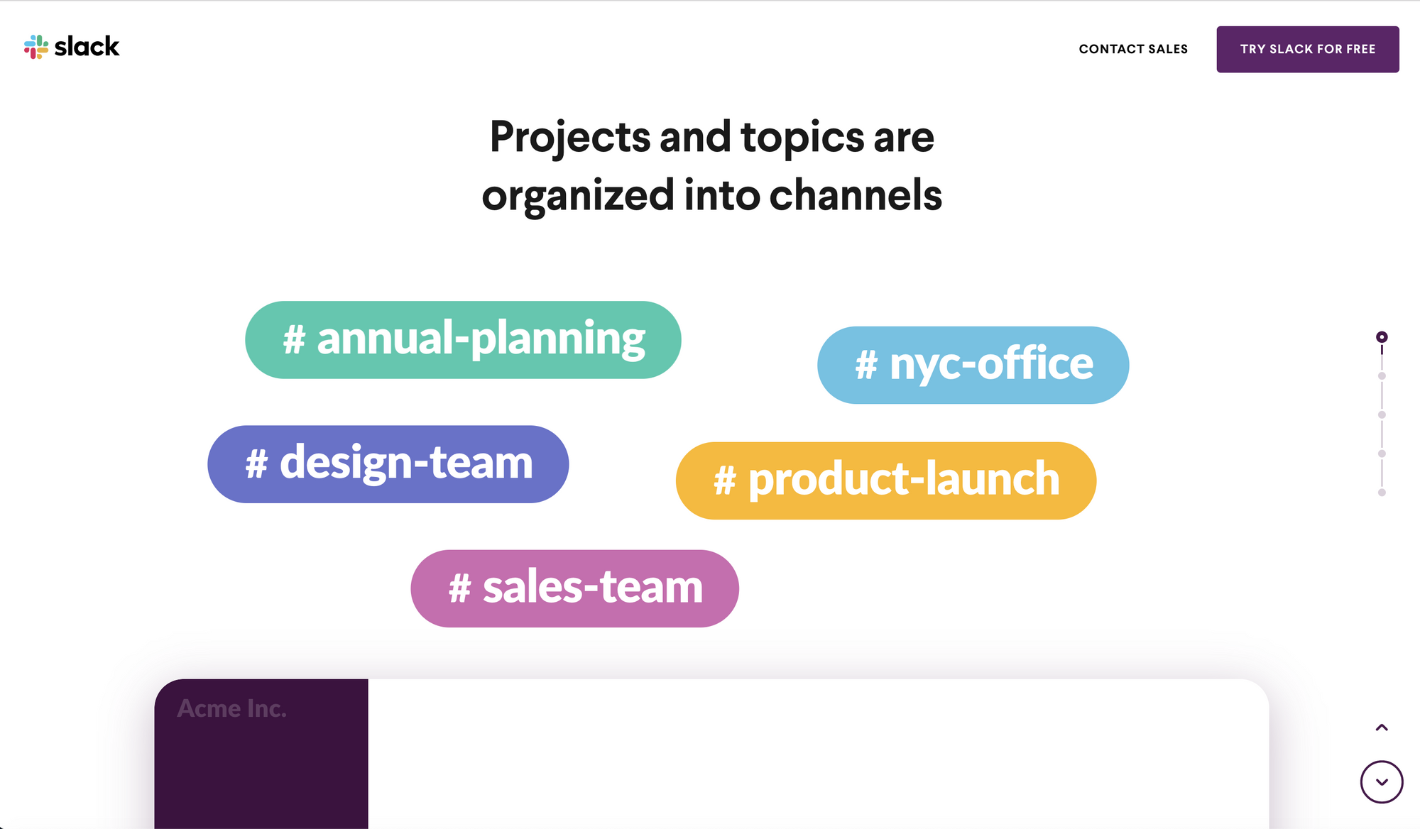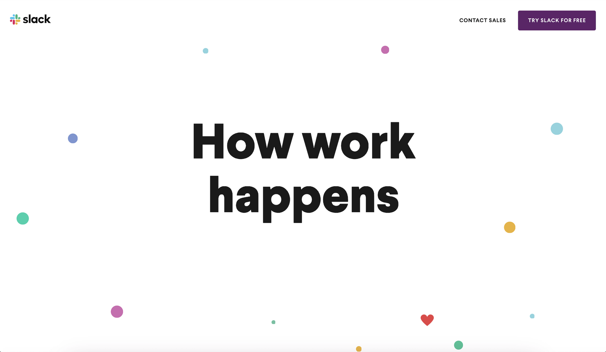 The two CTAs below the headline provide a critical clue to Slack’s go-to-market strategy: product led growth (PLG). By highlighting “Try Slack” rather than “See The Demo” and nudging prospects to sign up and onboard immediately, Slack emphasizes the product (rather than a traditional sales meeting) as its primary customer acquisition channel. Want to contact Slack’s sales team? You’ll have to scroll all the way to the bottom of the page to find out how. Even as it targets the world’s largest enterprise accounts, Slack’s customer acquisition strategy rests on getting prospects to use its product.